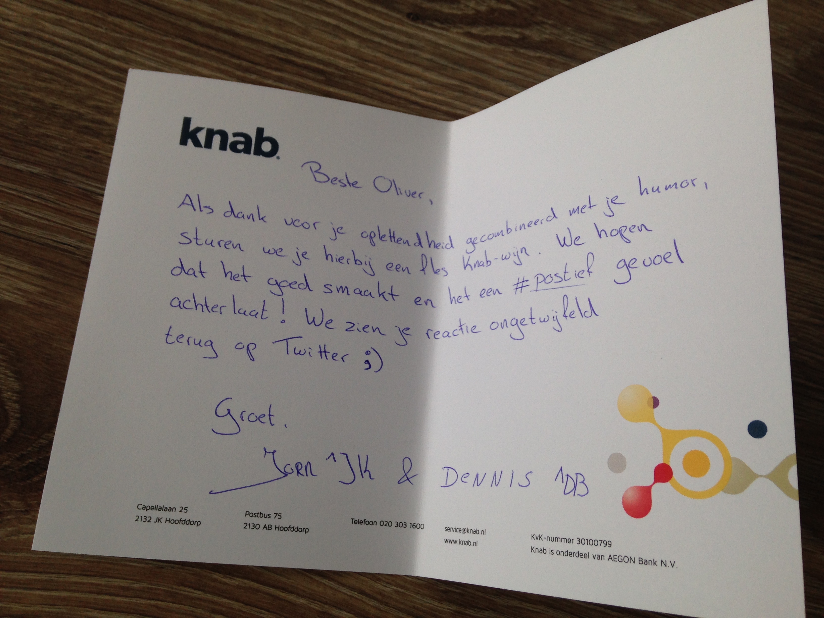 Ik kreeg na een dm voor mijn adres een mooie branded fles wijn en dit hilarische handgeschreven kaartje van Knab binnen. Bedankt, Jorn en Dennis!
